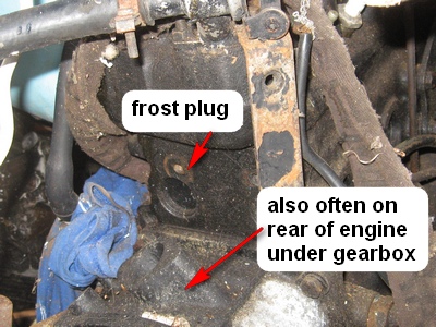 - Frost Plugs are usually on the sides of the motor under the manifold, the back of the head and the back of the block under the gearbox bellhousing (look for water coming out between the motor and gearbox). Anyone who's had to pull out a gearbox to replace a frost plug thinks both that brass frost plugs are better than steel ones (they don't rust) and that a good antifreeze with corrosion inhibitor in it is well worth the money. The temporary get you home solution is to fill the hole with panelbeaters filler usually called bog.