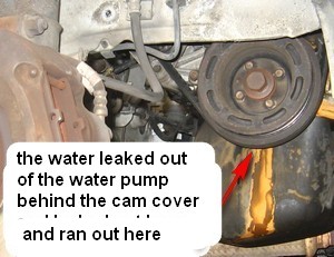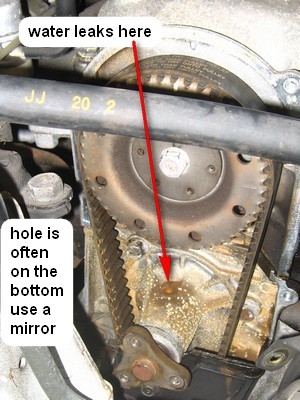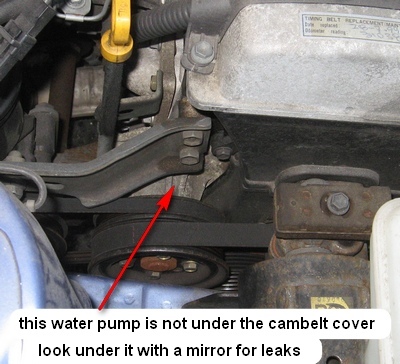 - Water Pump leaks are usually a steady drip from the bottom of the pump. Some water pumps are behind the cambelt cover in which case the water may appear at the bottom of the cam cover.