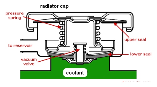 - Radiator caps ned to be pressure tested to make sure they allow coolant to flow to the overflow bottle at the correct pressure. Inspect the rubber gaskets. At higher pressures water boils at a higher temperature. Although the coolant should never reach 100 degrees C it definetely helps if the water doesn,t boil if it does.