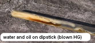 - Blown Head Gaskets can leak water into the combustion chamber or to the outside of the head between the head and the block. The biggest giveway is if the oil is a milky color and/or if the engine oil level is very high. Pull out the dipstick and check the colour and level of the oil. Take the radiator cap off and look for a stream of bubbles in the radiator. Give the engine a couple of quick revs and if the water shoots up into the air you probably have a blown head gasket. See the seperate head gasket section for more information on blown head gaskets.